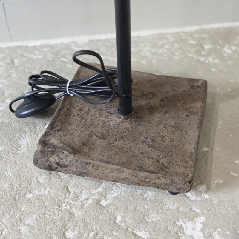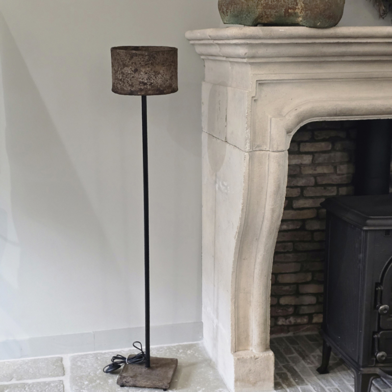 Stoere staande lamp met stoere kap erop ,deze kap is gemaakt van een combinatie klei en leem