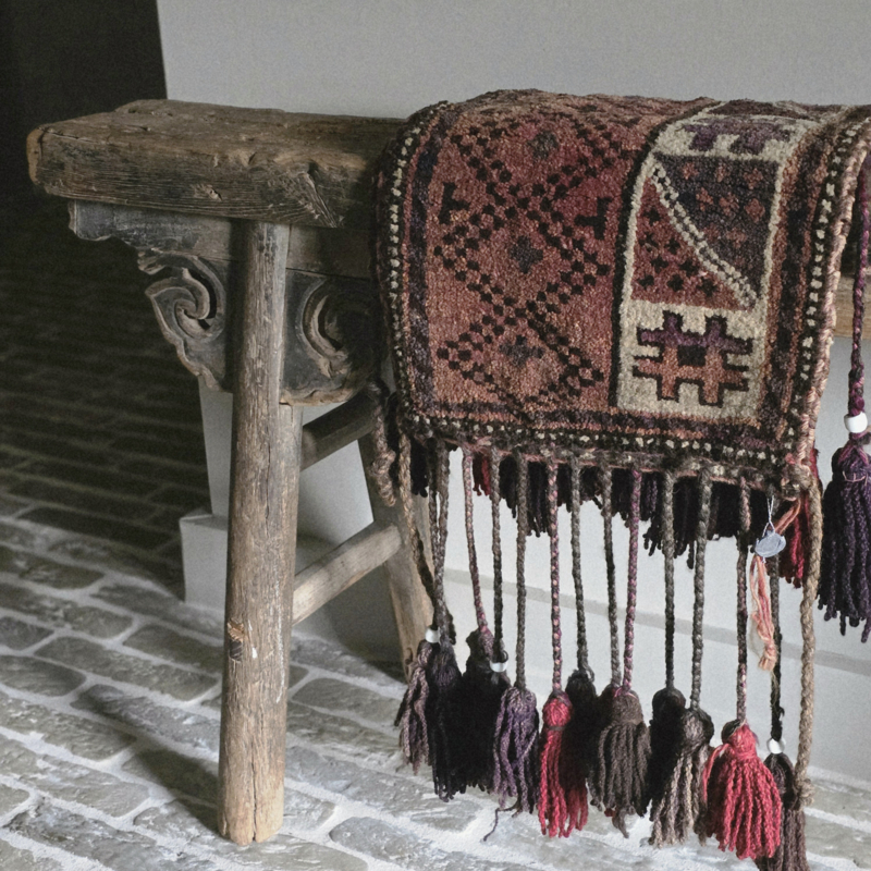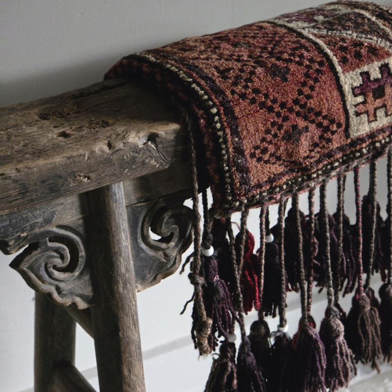 Authentieke Perzische loper met originele kwastjes om mee te decoreren b.v over een bankje , sitetable of tegen een muur .
