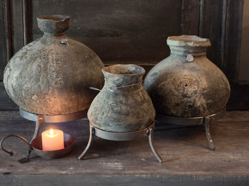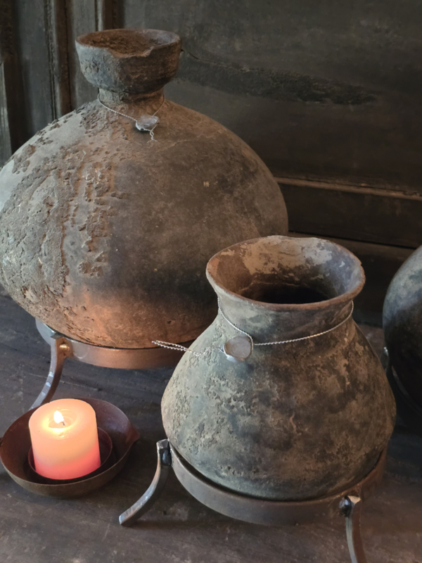 Uniek oud stenen kruikje op statief van Hoffz vooraan