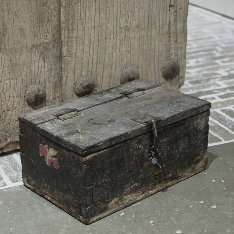 Oud Houten Kistje met Roestig IJzerbeslagStoer Houten Kistje met IJzerbeslag