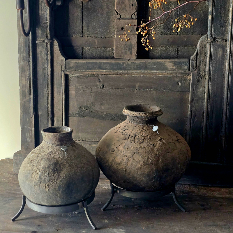 Unieke Kruik Oneofakind op StatiefUnieke Kruik op statief omlijst met ijzerdraad ,een echte Eycatcher in U interieur